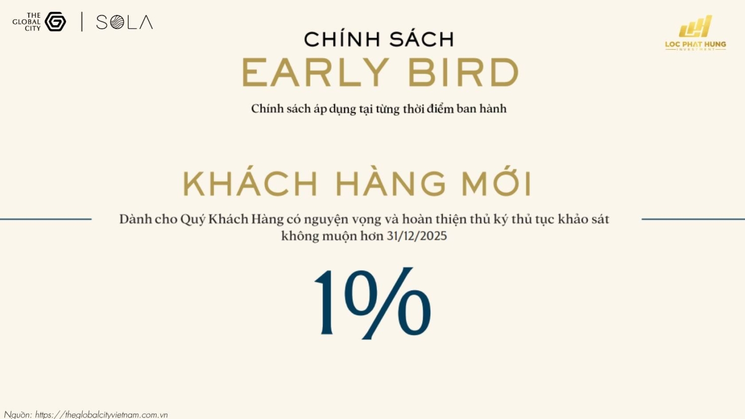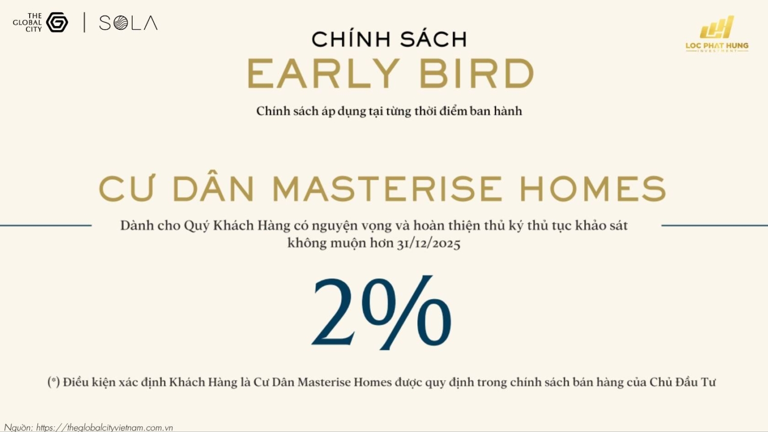 Như một lời tri ân, chủ đầu tư dành tặng ưu đãi chiết khấu trực tiếp 2% vào giá bán cho những anh chị đã từng sở hữu sản phẩm do Masterise phát triển. Đây là đặc quyền dành cho cộng đồng cư dân thân thiết, giúp anh chị dễ dàng mở rộng danh mục đầu tư tại Sola Villa The Global City với mức giá ưu tiên nhất. Chính sách này áp dụng cho cả người thân trong gia đình (Bố mẹ, vợ chồng, con cái), tạo điều kiện cho các gia đình đa thế hệ cùng hội tụ về bán đảo sinh thái thượng lưu này.