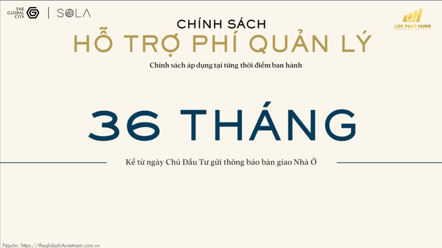 Sống tại Biệt thự Sola, anh chị không chỉ sở hữu một ngôi nhà mà còn sở hữu một hệ sinh thái dịch vụ chuẩn 5 sao. Masterise Homes tặng kèm gói miễn phí quản lý vận hành trong 3 năm đầu tiên, được thực hiện bởi Masterise Property Management. Bên cạnh đó là các suất quà tặng trải nghiệm tại City Park và các khu tiện ích cao cấp khác trong đại đô thị. Mọi thông tin chi tiết về bảng tính dòng tiền và các suất ngoại giao, anh chị có thể liên hệ qua website Lộc Phát Hưng để được hỗ trợ nhanh nhất.