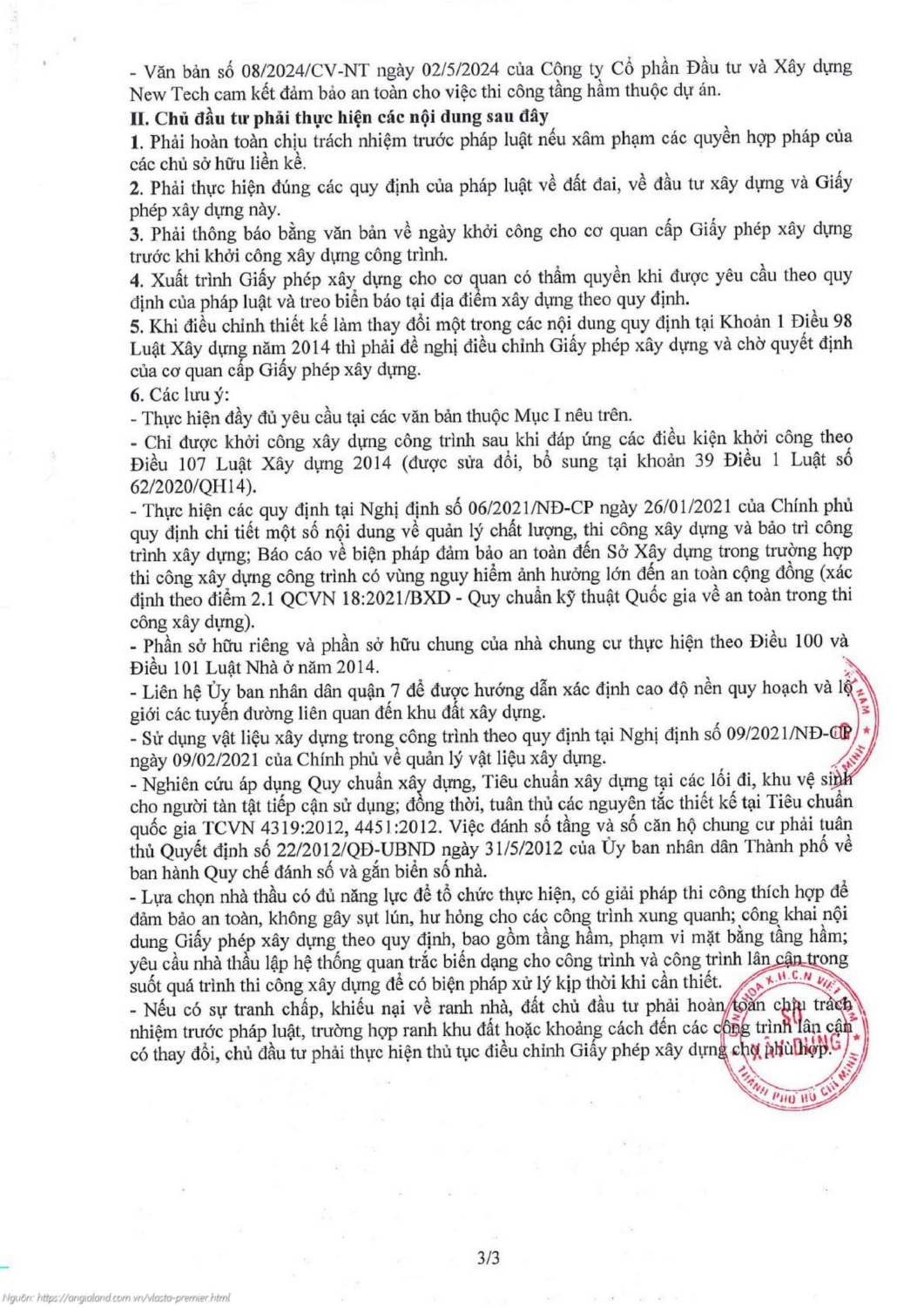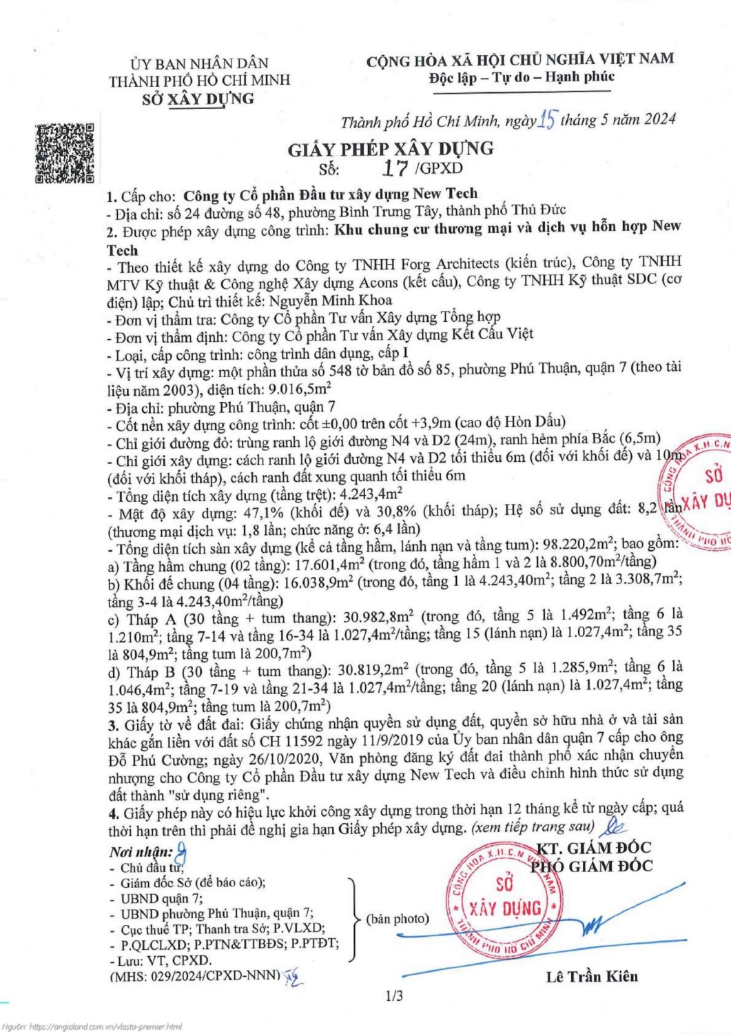 Vlasta Premier đã chính thức sở hữu Giấy phép xây dựng số 17/GPXD ban hành ngày 15/05/2024. Văn bản này cho phép triển khai thi công phần thân với quy mô 2 tầng hầm và 35 tầng nổi. Đây là mốc pháp lý quan trọng nhất, khẳng định sự tuân thủ pháp luật tuyệt đối của chủ đầu tư và đảm bảo dự án hình thành đúng tiến độ.