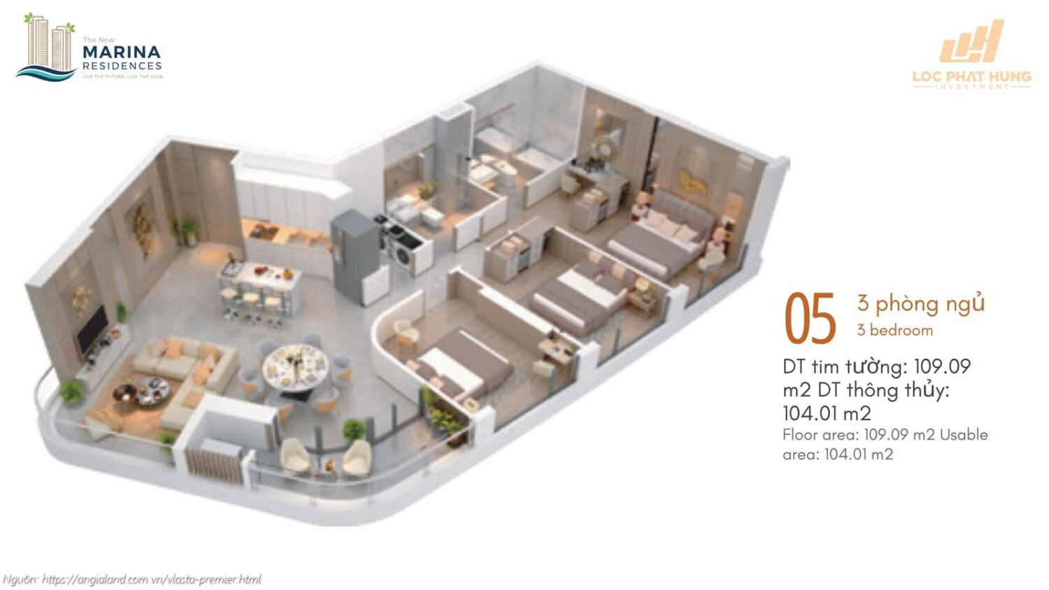 - Căn hộ 3 Phòng ngủ (93m² – 103m²): Giá đầu tư từ 8.8 tỷ – Hiệu suất thuê kỳ vọng từ 25-30 triệu/tháng.