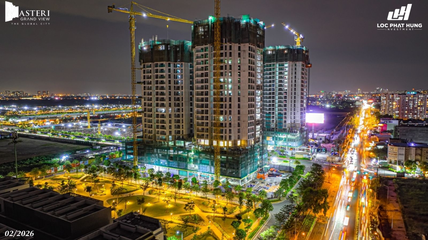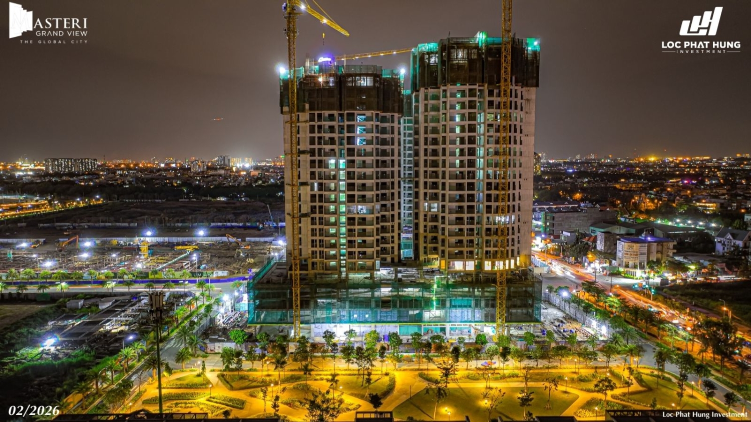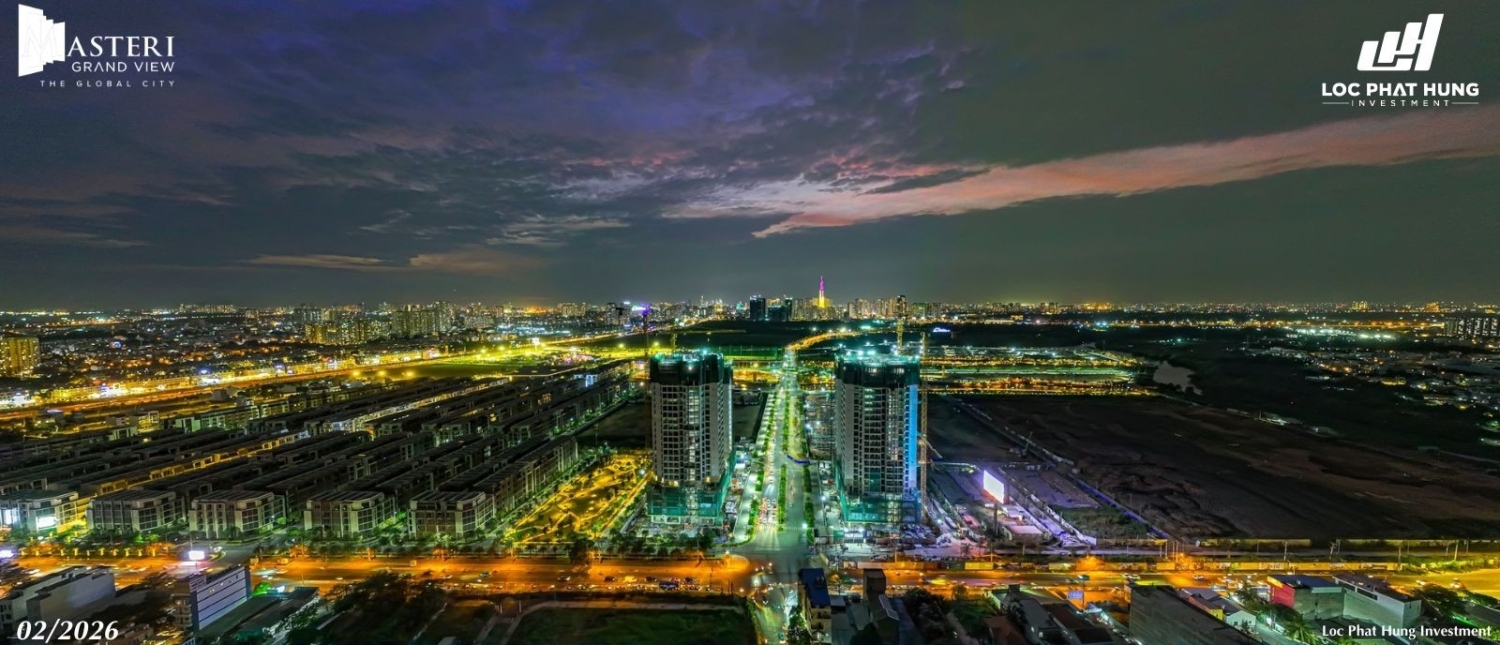 Tiến độ rực rỡ ban đêm của 2 tòa tháp Masteri Grand View sau lễ cất nóc tháng 02/2026. Hotline 0937.098.890