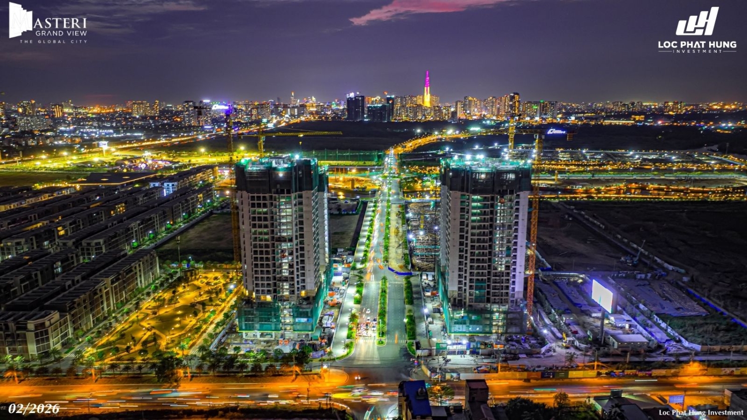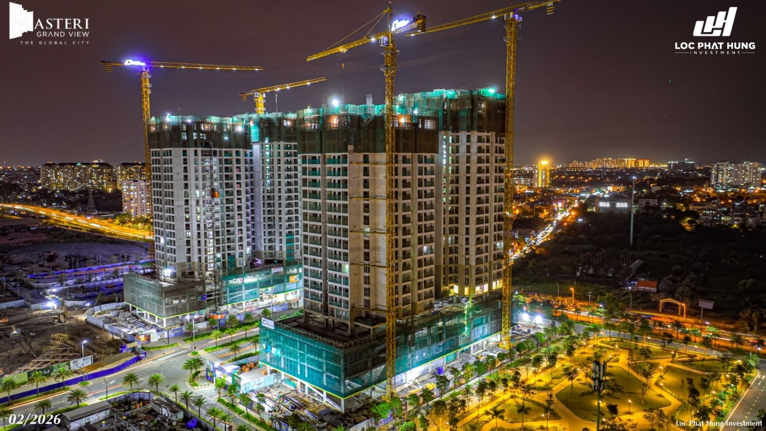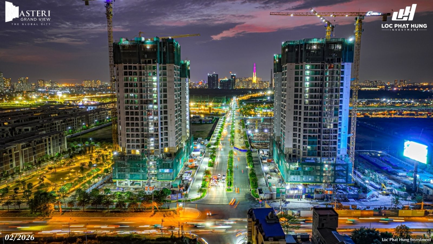 Tiến độ rực rỡ ban đêm của 2 tòa tháp Masteri Grand View sau lễ cất nóc tháng 02/2026. Hotline 0937.098.890